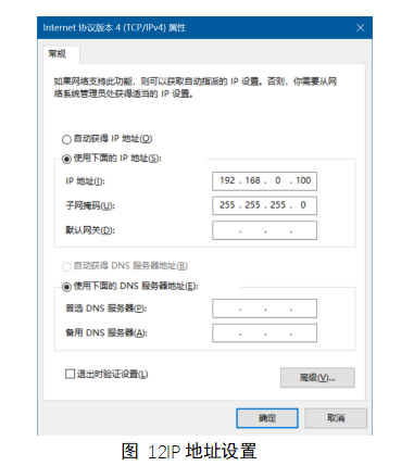h. 双击Internet协议版本4(TCP/IPv4),打开IP设置对话框,将IP地址的前三个字段设置为与跟踪仪IP地址相同的值(192.168.0.x),第四个字段设置为不同的值(通常是100),子网掩码设置为255.255.255.0;