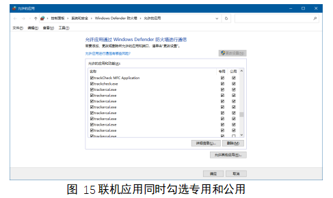 l. 滚动列表,找到所有需要连接跟踪仪的应用程序,如TrackerCal,OminCal,SALaserTrackerDI,Polyworks/ImInspect等,确保所有应用都勾选了专用和公用两列;