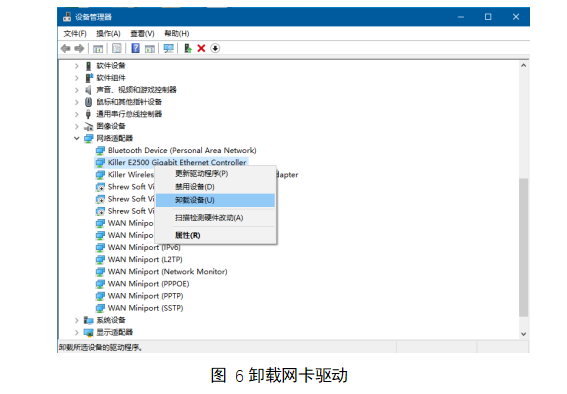 f) 在设备管理器的根节点上右击扫描检测硬件改动重新安装网卡;